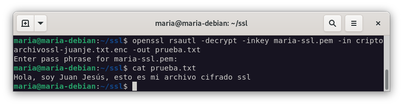openssl rsautl -decrypt -inkey maria-ssl.pem -in criptoarchivossl-juanje.txt.enc -out prueba.txt cat prueba.txt