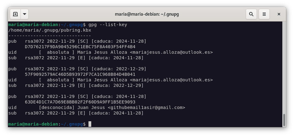 gpg --list-keysmaria@maria-debian:~/.gnupg$ gpg --list-keys /home/maria/.gnupg/pubring.kbx ------------------------------ pub rsa3072 2022-11-29 [SC] [caduca: 2024-11-28] D7D76217F9DA9045296C1EBC75F8A403F54FF4B4 uid [ absoluta ] Maria Jesus Alloza <mariajesus.alloza@outlook.es> sub rsa3072 2022-11-29 [E] [caduca: 2024-11-28] maria@maria-debian:~/.gnupg$ -