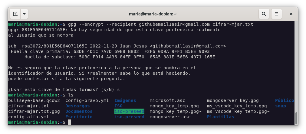 maria@debian gpg --encrypt --recipient githubemail1asir@gmail.com cifrar-mjar.txt