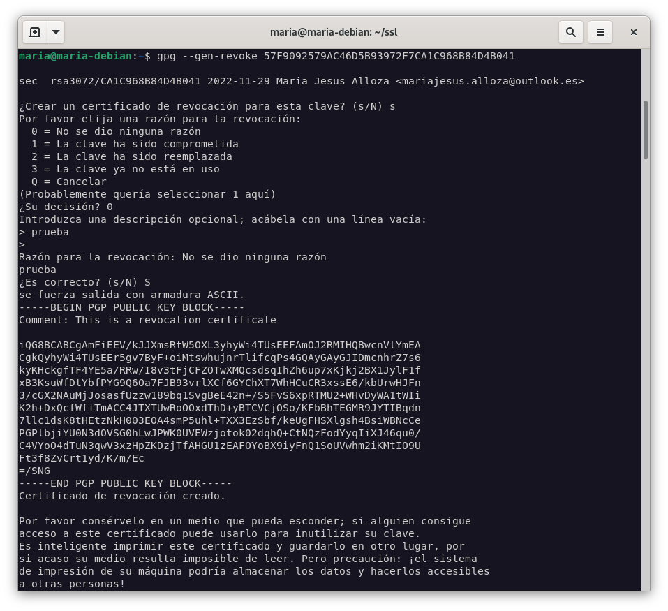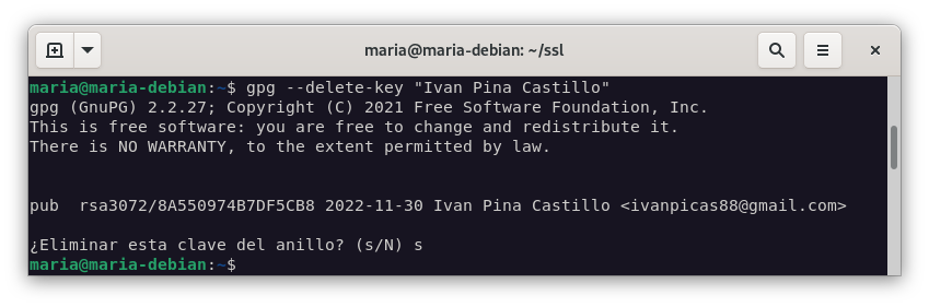 maria@debian gpg –delete-key “maria” Se ha eliminado la clave pública *****************