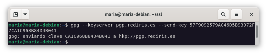Exporta tu clave pública al servidor pgp.rediris.es