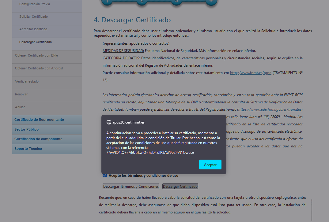 - Instalamos el certificado en el navegador. Para ello, accedemos a la página de la FNMT y descargamos el certificado. Nos pedirá nuestro DNI, nuestro primer apellido y un código de validación que nos han mandado a nuestro correo, con el que hemos solicitado el certificado. Una vez descargado, lo instalamos en el navegador.