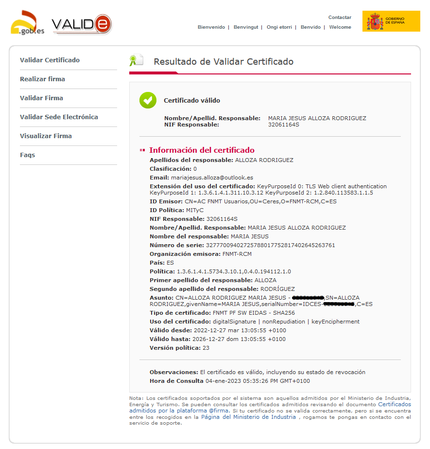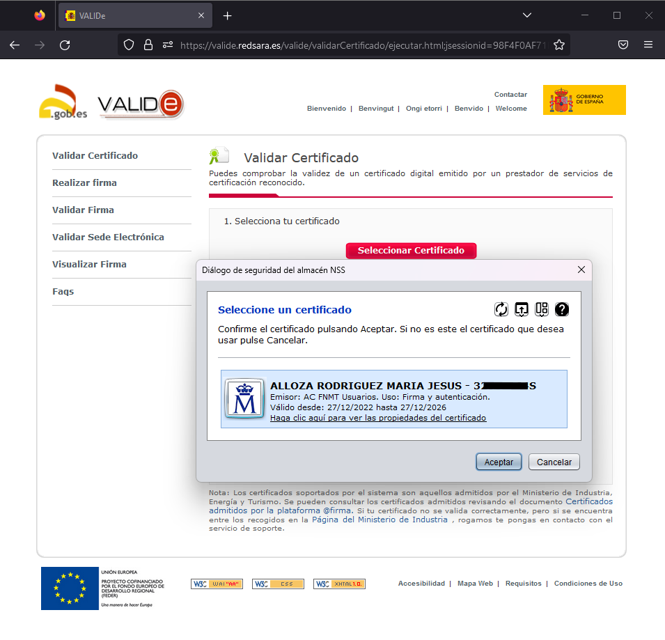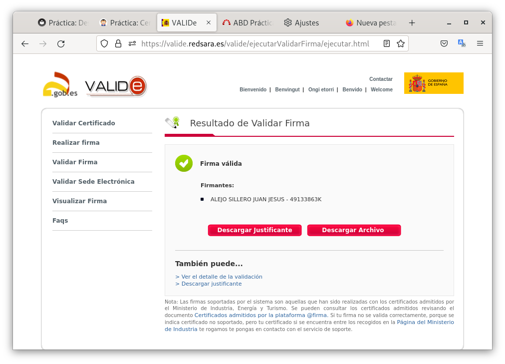 Instala en tu ordenador el software autofirma y desde la página de VALIDe valida tu certificado. Muestra capturas de pantalla donde se comprueba la validación.