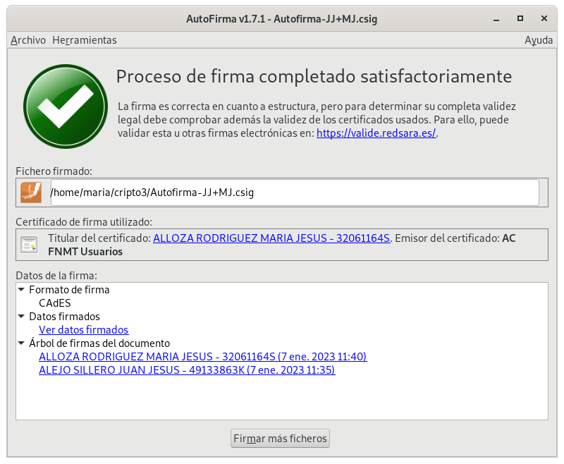 - Utilizando la página VALIDe y el programa autofirma, firma un docmento con tu certificado y envíalo por correo a un compañero.