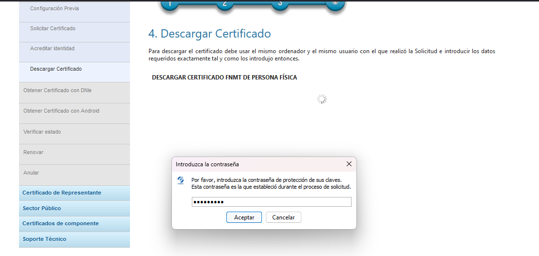 - A continuación, tras aceptar los términos y condiciones, nos pedirá que introduzcamos la contraseña que hemos establecido al solicitar el certificado. Una vez introducida, nos pedirá que introduzcamos la contraseña de nuestro certificado para poder instalarlo.