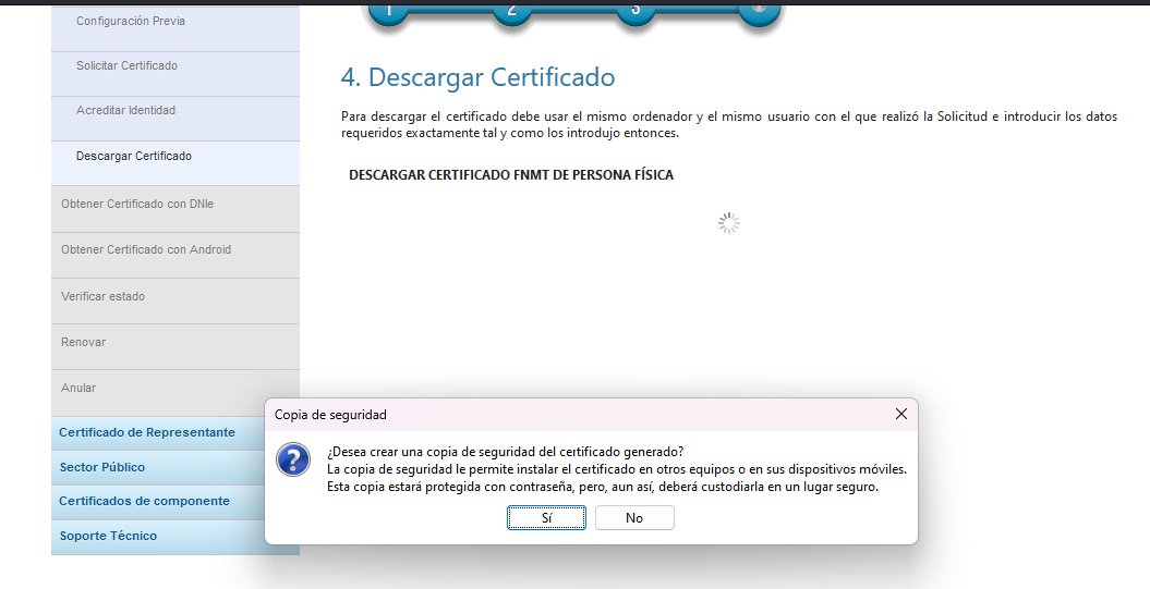 Tras la descarga, nos preguntará si queremos crear una copia de seguridad del certificado.