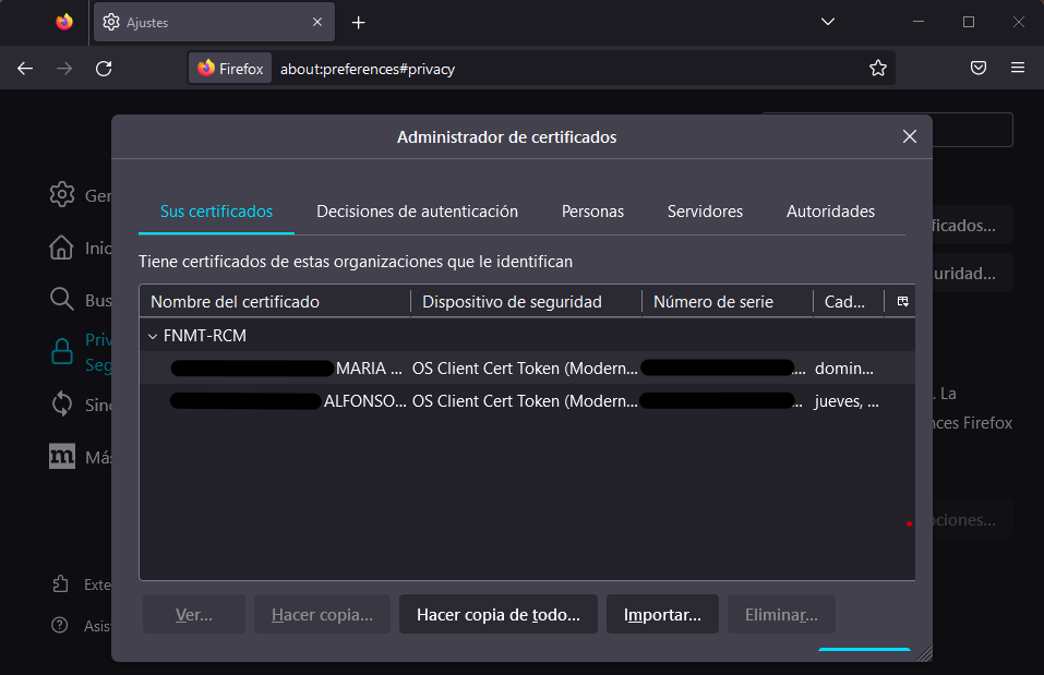 Ajustes > Privacidad y Seguridad > Certificados > Ver Certificados. Se abrirá una ventana con todos los certificados instalados en nuestro navegador. En ella, podemos ver el certificado que hemos instalado.