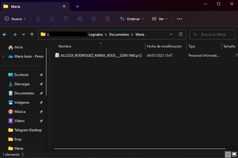 Ajustes > Privacidad y Seguridad > Certificados > Ver Certificados. Se nos abrirá la misma ventana de la imagen anterior. Clicamos en el certificado que queremos hacer una copia de seguridad y pulsamos en “Hacer copia”. Se nos abrirá una ventana en la que nos pedirá que introduzcamos la contraseña de nuestro certificado. Una vez introducida, nos pedirá que introduzcamos una contraseña para proteger nuestra copia de seguridad. Finalmente, tendremos nuestra copia de seguridad. En mi caso, he almacenado mi clave en un NAS privado, en un directorio cifrado con clave alfanumérica. De esta forma, si alguien accede a mi NAS, no podrá acceder a mi clave privada, ya que no conoce la clave de cifrado.