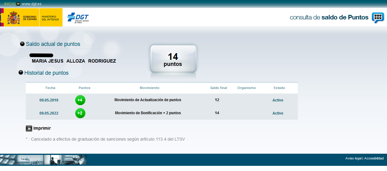 - Accedemos a la web de la DGT para verificar el funcionamiento de nuestro certificado digital accediendo a nuestro historial de puntos.