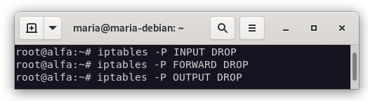 - Vamos a configurar la política por defecto DROP para las cadenas INPUT, FORWARD y OUTPUT.
