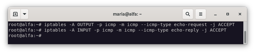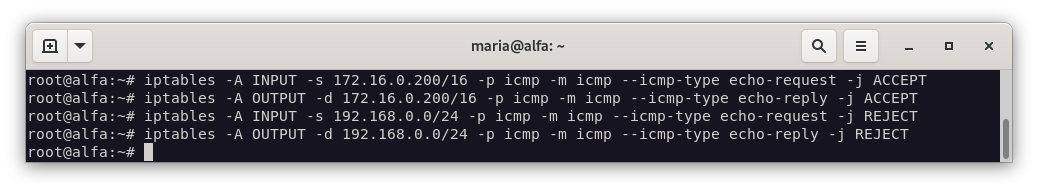 - A la máquina Alfa se le puede hacer ping desde la DMZ, pero desde la LAN se le debe rechazar la conexión (REJECT) y desde el exterior se rechazará de manera silenciosa.
