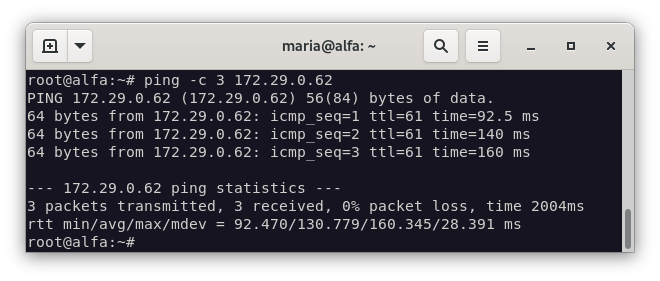 Para probarlo, haremos ping desde alfa hacia el exterior. En mi caso, he hecho ping a mi máquina.