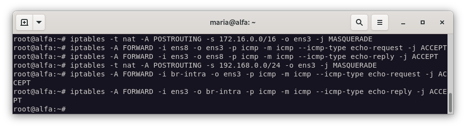 - Configura la máquina Alfa para que las máquinas de LAN y DMZ puedan acceder al exterior.