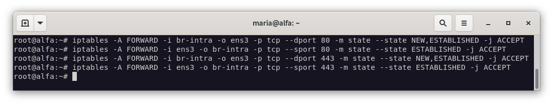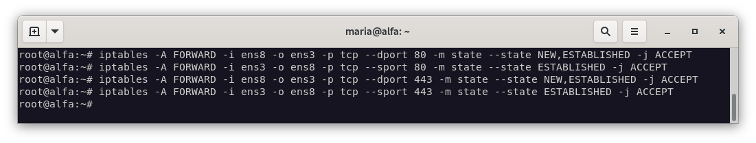iptables -A FORWARD -i ens3 -o ens8 -p tcp --sport 443 -m state --state ESTABLISHED -j ACCEPT