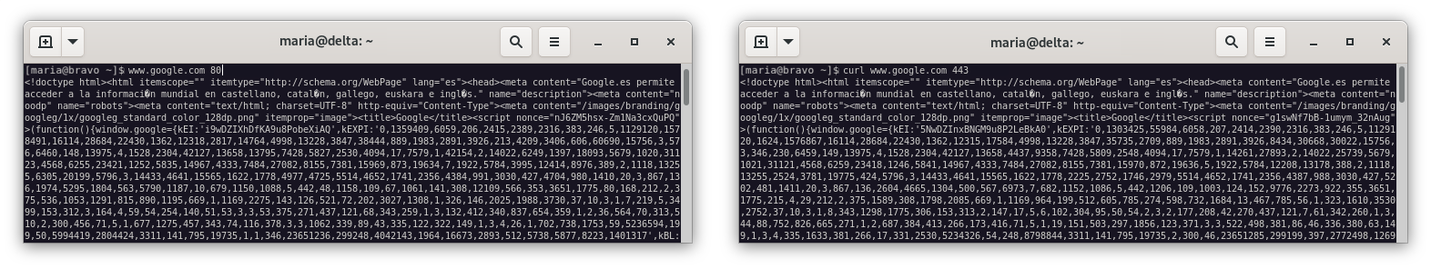 Para probar el funcionamiento de estas reglas, vamos a realizarlo desde delta con el comando curl para comprobar que podemos navegar.