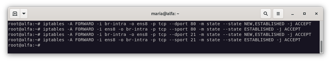 iptables -A FORWARD -i br-intra -o ens8 -p tcp --dport 21 -m state --state NEW,ESTABLISHED -j ACCEPT