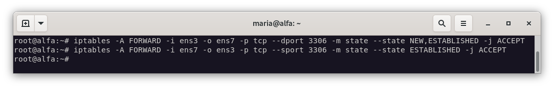 iptables -A FORWARD -i br-intra -o ens8 -p tcp --sport 3306 -m state --state ESTABLISHED -j ACCEPT