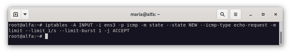 iptables -A INPUT -i ens8 -p icmp -m state --state NEW --icmp-type echo-request -m limit --limit 1/s --limit-burst 1 -j ACCEPT