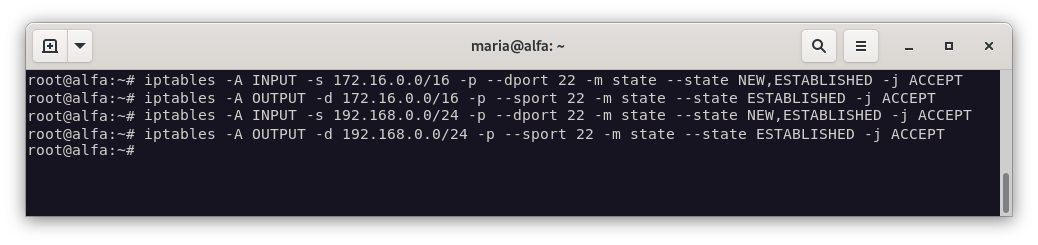iptables -A INPUT -s 172.16.0.0/16 -p --dport 22 -m state --state NEW,ESTABLISHED -j ACCEPT