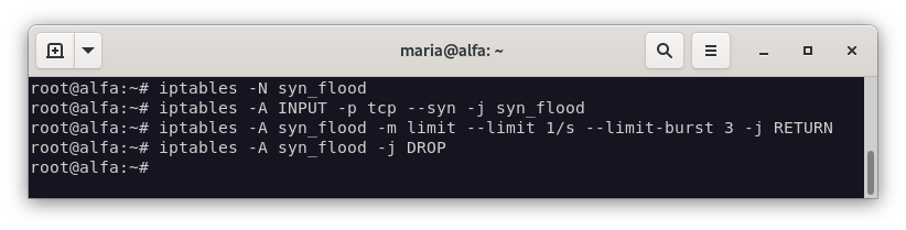 iptables -A INPUT -p tcp --syn -j syn_flood