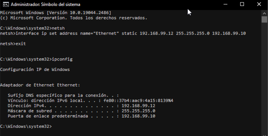 interface ip set address name="Ethernet" static 192.168.99.12 255.255.255.0 192.168.99.10