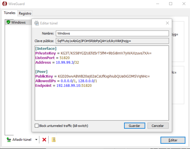 En la subventana que se abre, ya nos aparecen creadas ambas claves, la pública y la privada del servidor, por lo que solo tendremos que añadir la clave pública del servidor y la IP.