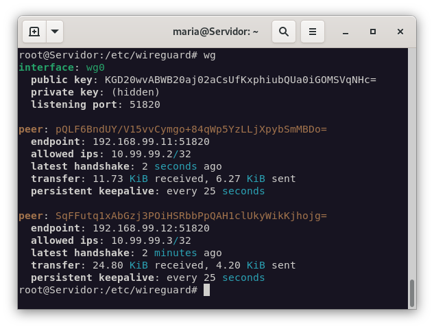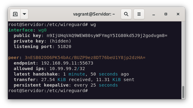 Configurado el cliente, deberemos configurar en el fichero wg0.congde servidor donde incluiremos el cliente que recientemente hemos configurado y el fichero quedaría de la siguiente manera:
