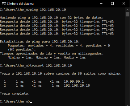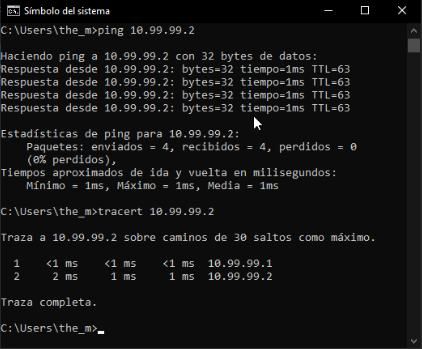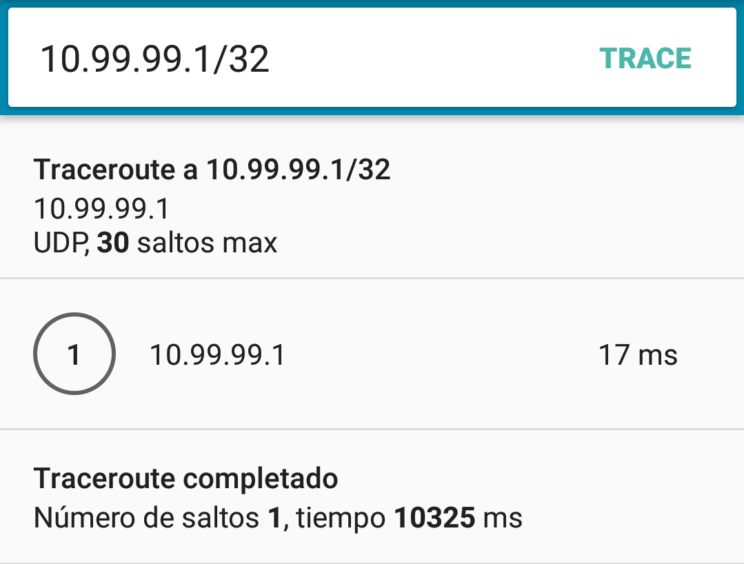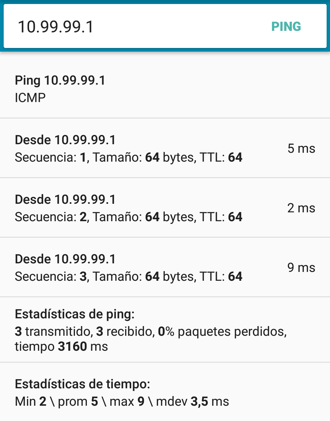 Para verificar que funciona correctamente, haremos ping desde el cliente interno al cliente android y desde el cliente android al servidor.