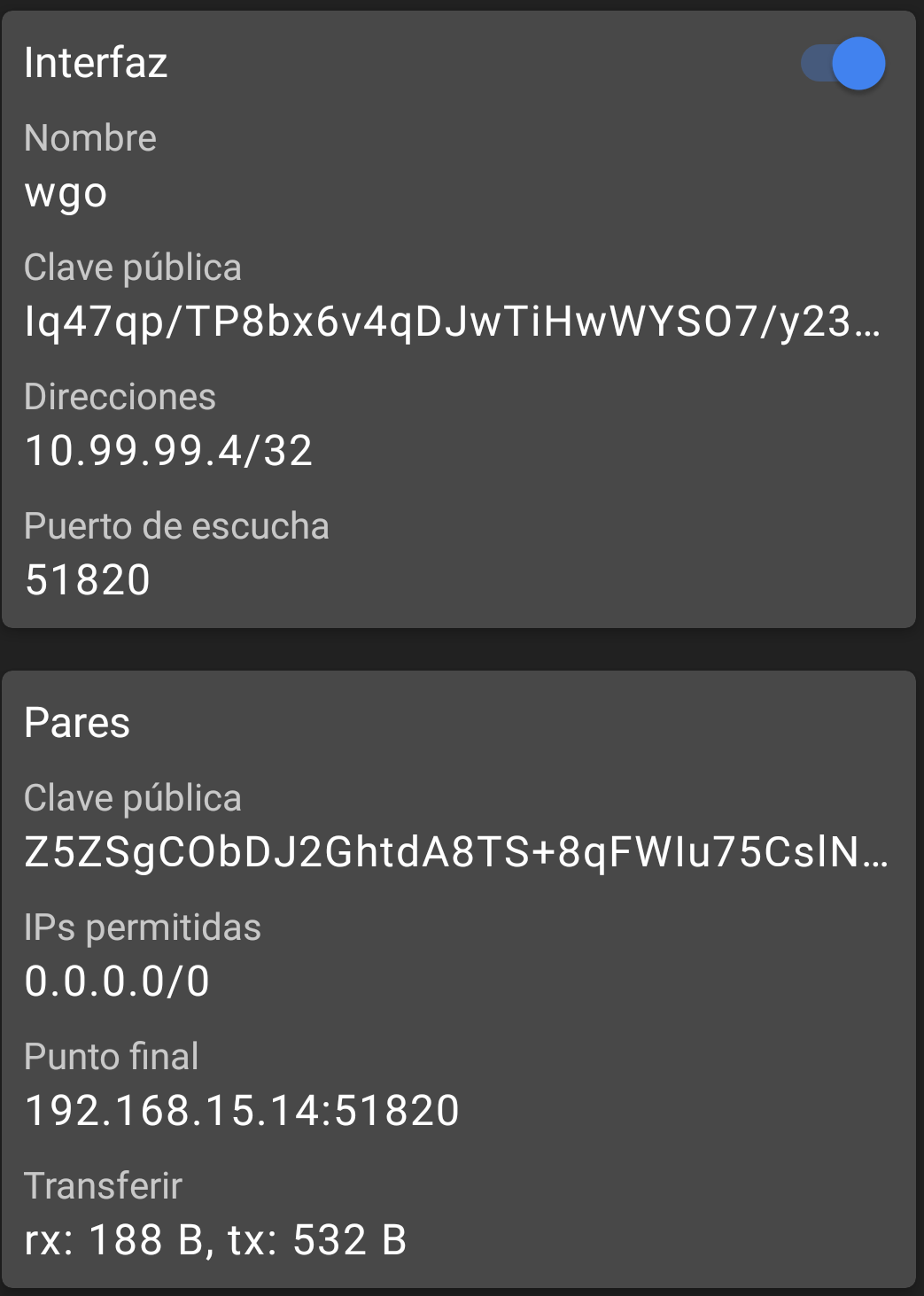 Para este punto del escenario, voy a usar mi máquina host como servidor VPN y mi móvil físico como cliente. Para ello, hemos instalado la aplicación WireGuard en el móvil y hemos configurado el servidor con la IP de mi móvil.