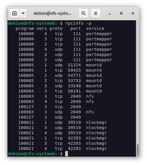 En la siguiente imagen podemos ver que el servicio está activo y que está a la escucha en el puerto 2049.
