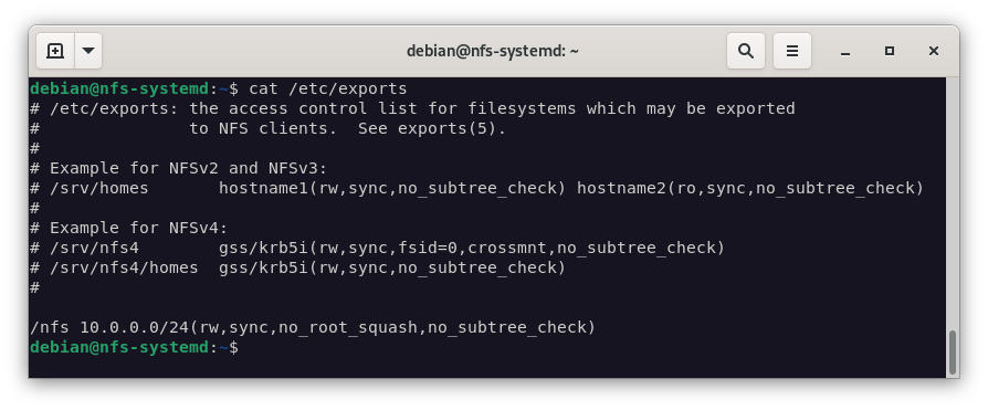 La configuración anterior permite que todos los clientes de la red 10.0.0.0/24 puedan acceder al punto de montaje /nfs con permisos de lectura y escritura.